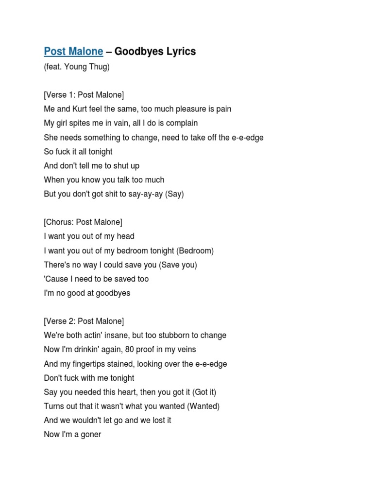 Video Music Post Malone Goodbyes Lyrics Ft Young Thug - Post malone] i want you out of my head i want you out of my bedroom tonight (bedroom) there's no way i could save you (save you) 'cause i need to be saved too i'm no good at goodbyes.